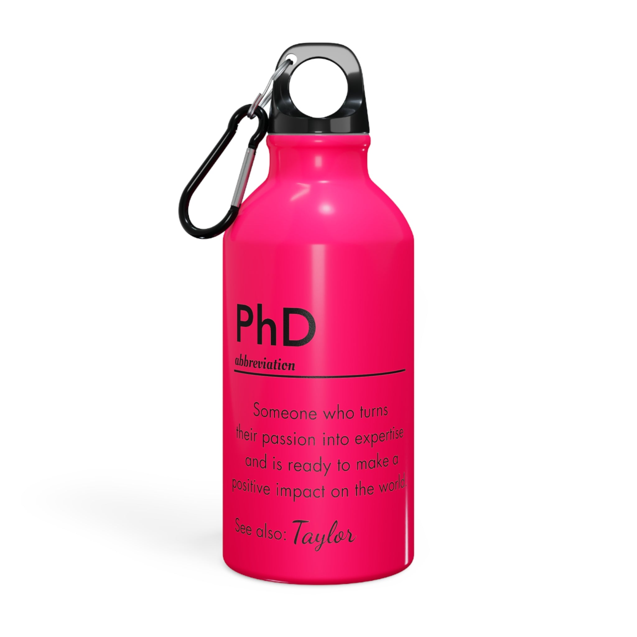 PhD Water Bottle in Pink with Carabiner and Motivational Quote PhD Water Bottle in Silver with Inspirational Design