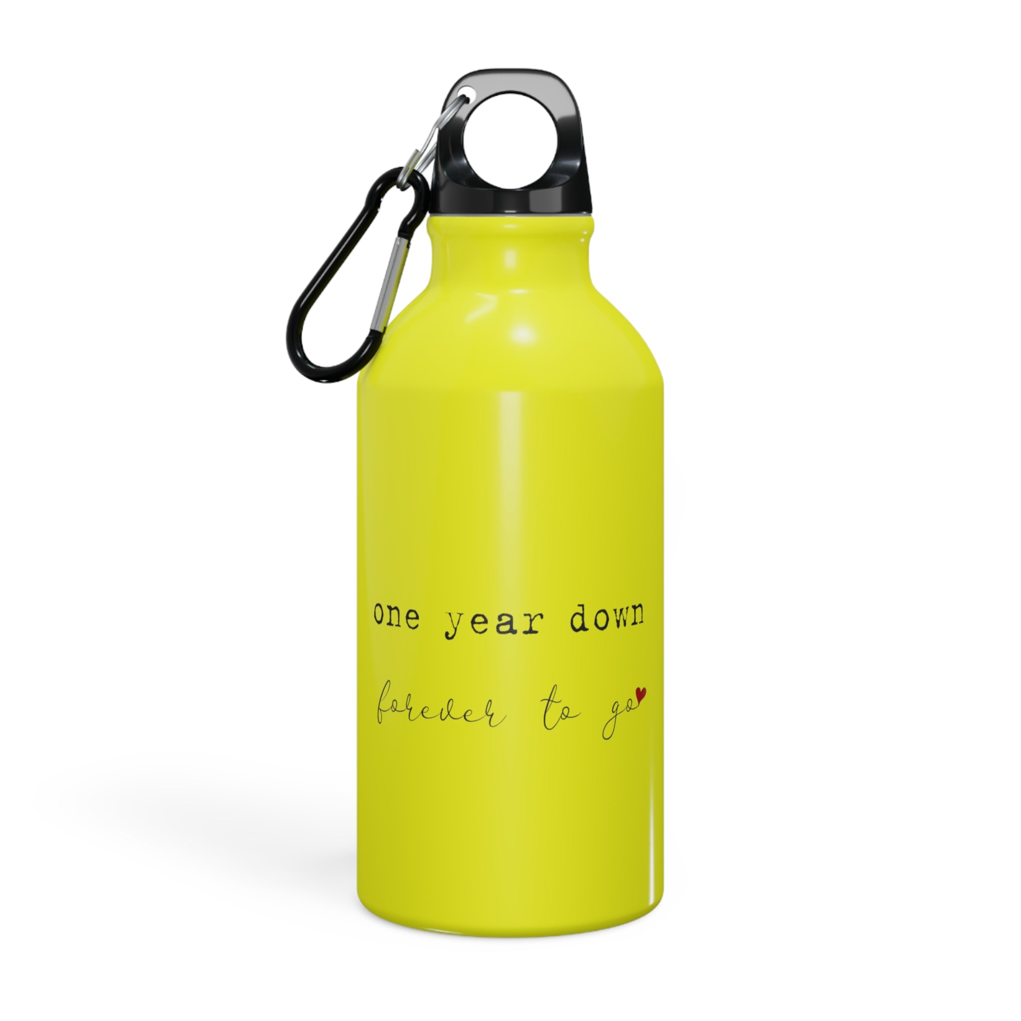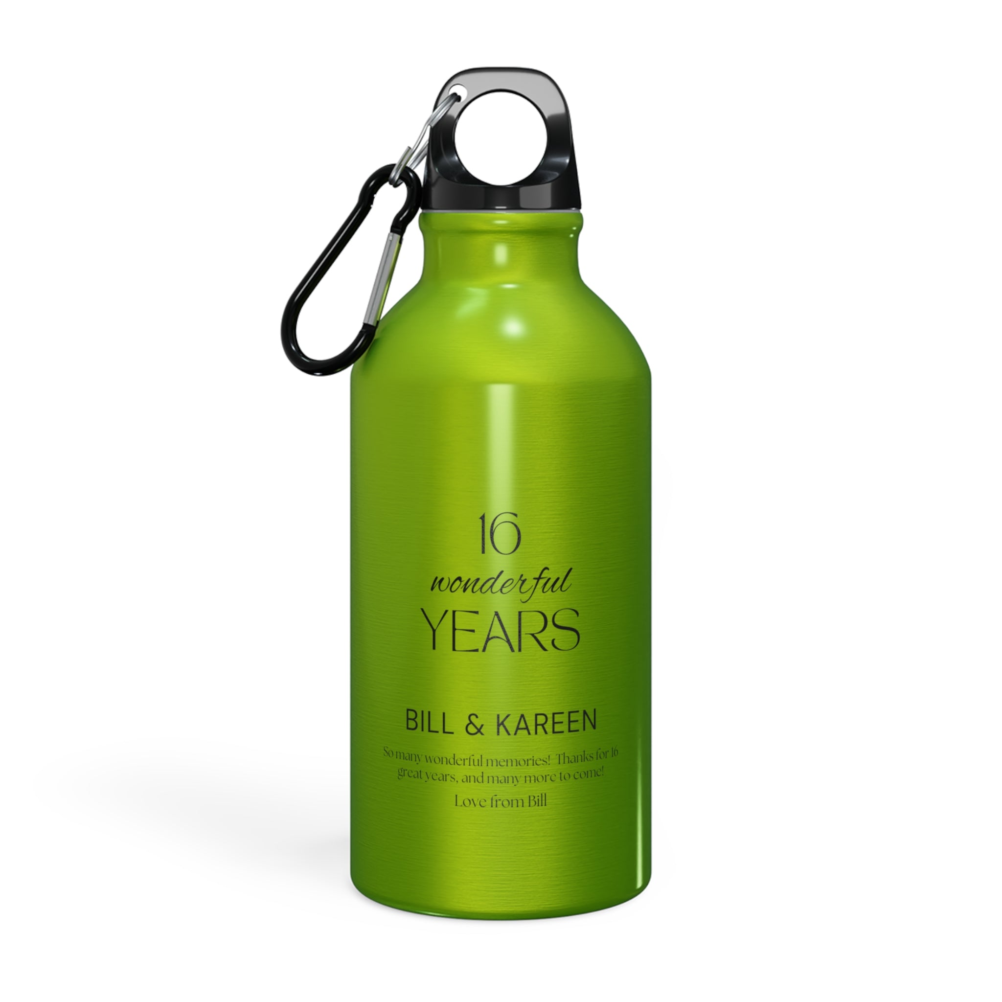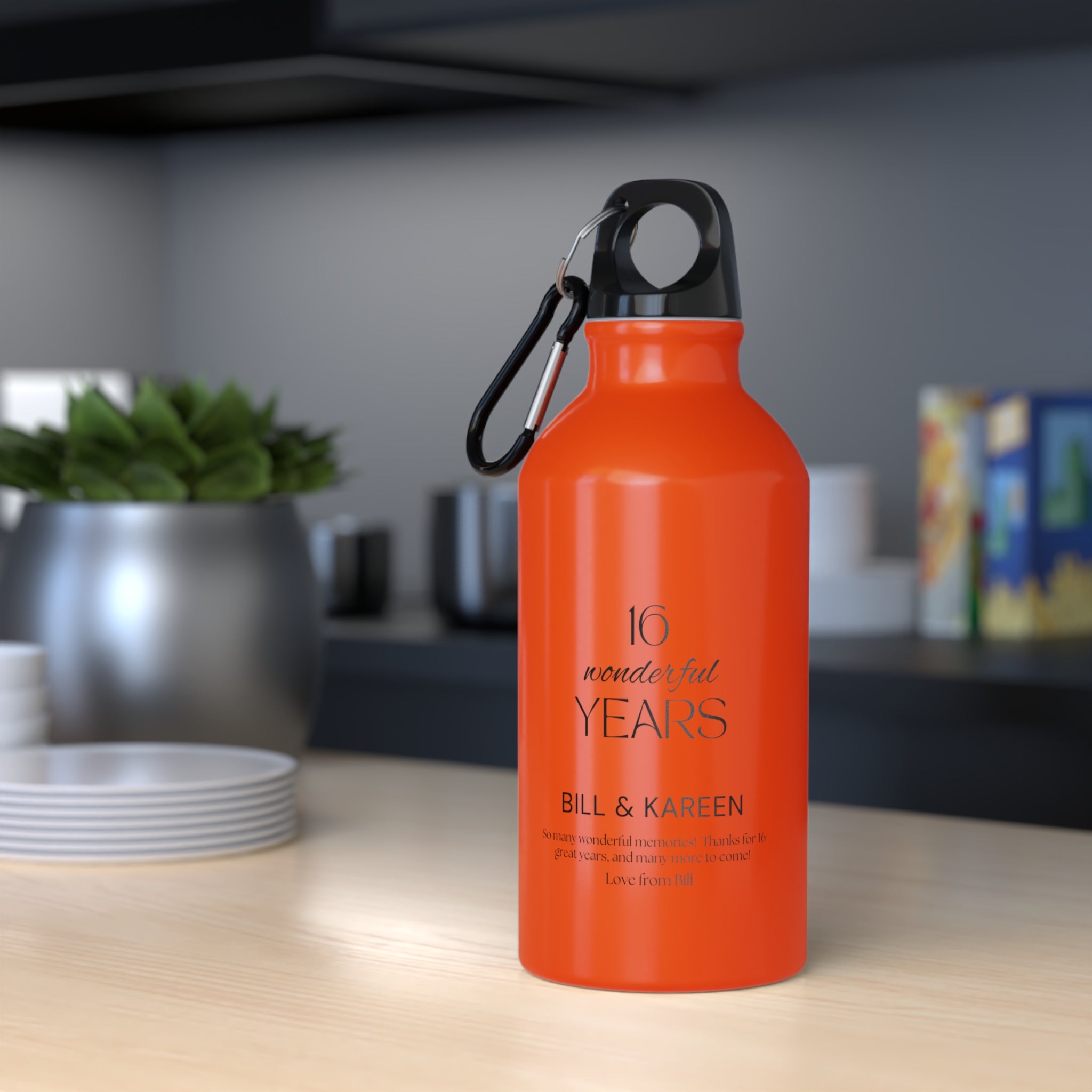 Personalized water bottle in green for marking special milestones. Customizable water bottle in orange, perfect for special gifts and keepsakes.