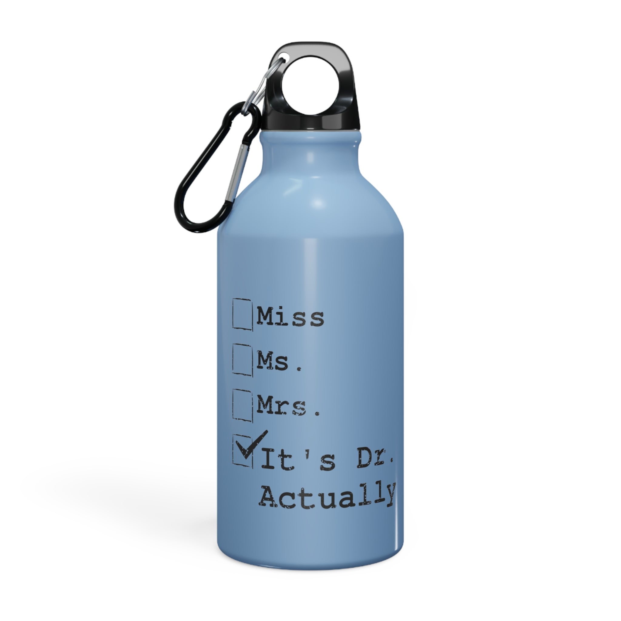 Personalized Water Bottle with "It's Dr. Actually" Design Dr. Thompson Water Bottle in Stainless Steel on Kitchen Counter