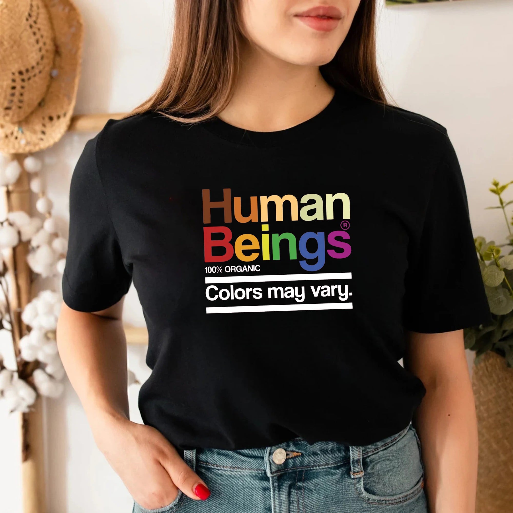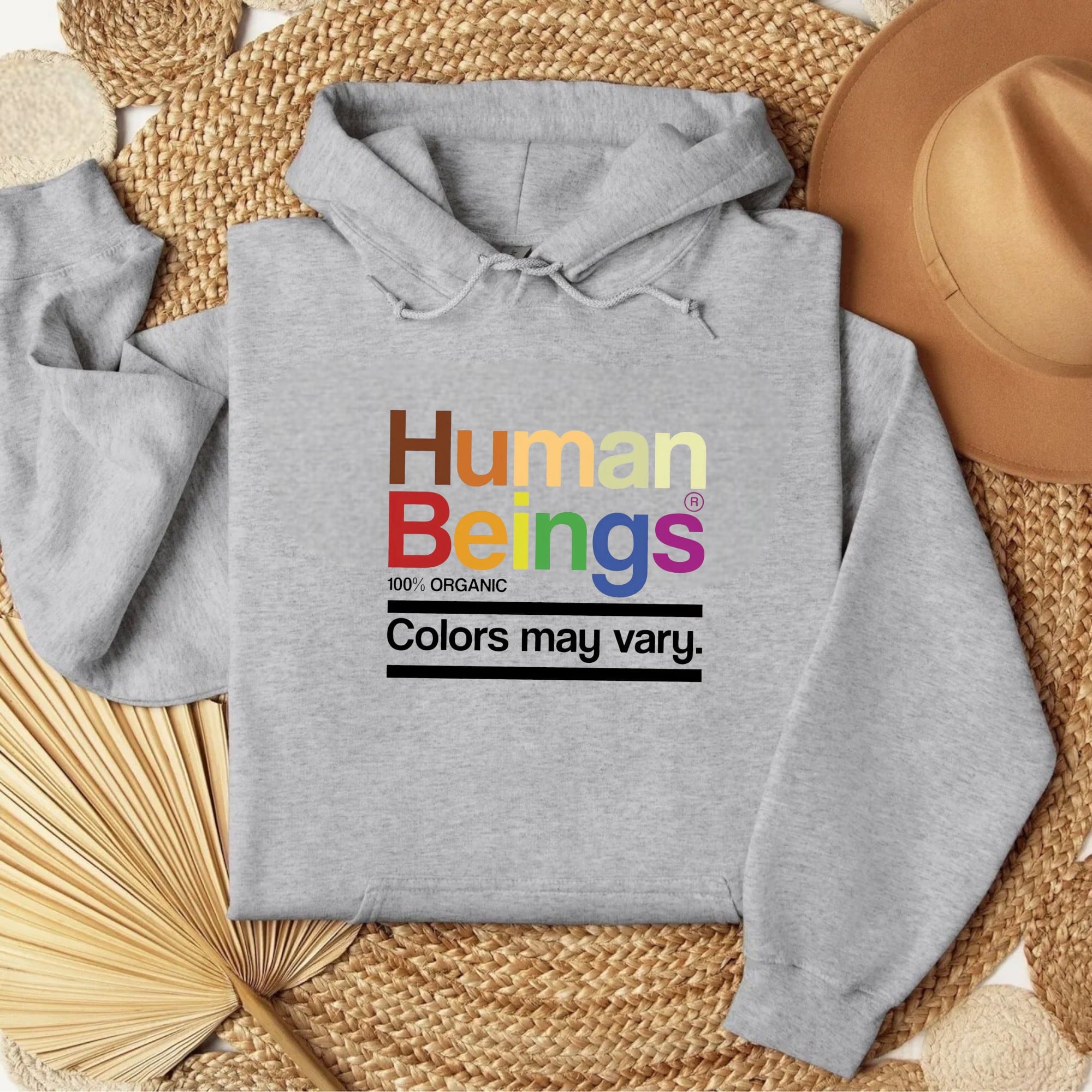 Soft and stylish "Human Beings" hoodie with bold color design "Human Beings" rainbow graphic t-shirt with organic cotton material
